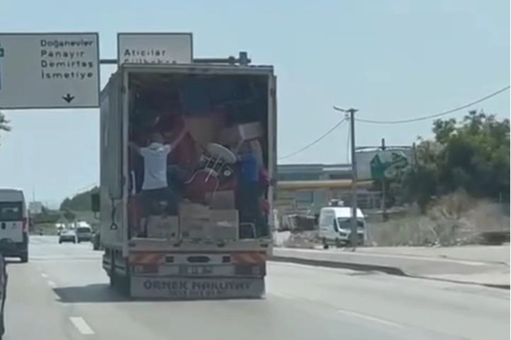 Merkez Osmangazi ilçesi Yakın Çevreyolu Küçükbalıklı Mahallesi yakınlarında kameraya kaydedilen nakliye firmasına ait kamyon, eşya dolusu yükle kilometrelerce ilerledi. Eşyalarının düşmemesi için kendi canlarını tehlikeye atan 2 çalışan ilginç görüntüler oluşturdu. O anları hayretle izleyen trafikteki sürücüler, korna ve selektör atarak uyarıda bulunsa da sürücü uyarıları dikkate almadan yoluna devam etti. İlginç yolculuk kameraya saniye saniye yansıdı.