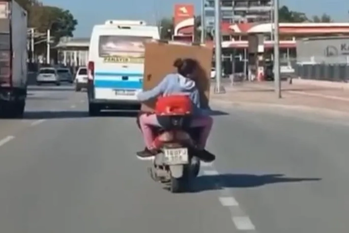 Bursa’nın Yıldırım ilçesinde anayola çıkan bir motosiklet sürücüsü arkasına aldığı kız çocuğuna eşya taşıttı. Kask takmadan kilometrelerce ilerleyen sürücü hem kendi, hem de arkasındaki küçük kız çocuğunu düşünmeden ilerlerken, tehlikeli yolculuk trafikteki vatandaşların kamerasına yansıdı.