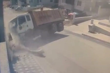 Kaza, saat 15.43'te Fatih Mahallesi Aşık Veysel Caddesi'nde meydana geldi. Yusuf K. (45) yönetimindeki 49 DC 275 plakalı kum yüklü kamyonun yokuş aşağı geri giderken freni patladı. Sürücünün kontrolünden çıkan araç hızla gitmeye başladı. Sürücü hızlanan araçtan atlarken, araç sitenin giriş duvarına çarparak devrildi. Araç devrildiği sırada kaldırımda bulunan bir vatandaş, kaçarak saniyelerle kurtuldu. Yaralı sürücü, kaza yerine sevk edilen ambulansla İnegöl Devlet Hastanesine kaldırıldı. Kaza anı bir iş yerinin güvenlik kamerasına saniye saniye yansıdı.