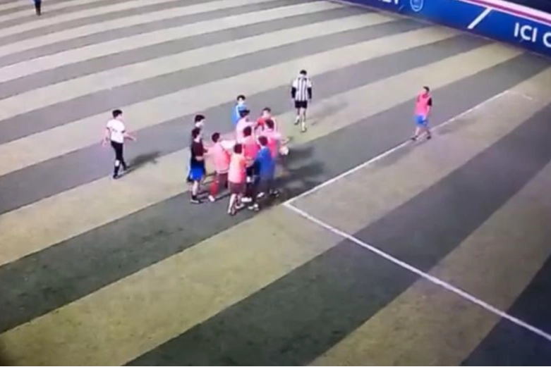 Bursa'nın Nilüfer ilçesinde halı saha maçı yapan iki takım arasında tartışma çıkınca, bazı oyuncular yumruk yumruğa birbirine girdi. O anlar kameraya yansıdı.