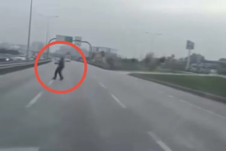 Bursa Yakın Çevre Yolu üzerinde araçların arasından yolun karşısına geçmeye çalışan kişi ölüme davetiye çıkarırken, o anlar cep telefon kamerasına yansıdı.