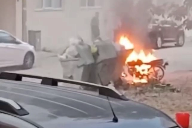 Olay, Gürsu ilçesinde meydana geldi. İddiaya göre sürücüsünün park halinde bıraktığı motosiklet, çöp konteynırlarının yanında bir anda alev aldı. Alevlerin hızla sardığı motosiklet küle dönerken, çevredekilerin müdahalesi yetersiz oldu. O anlar ise kameraya saniye saniye yansıdı.