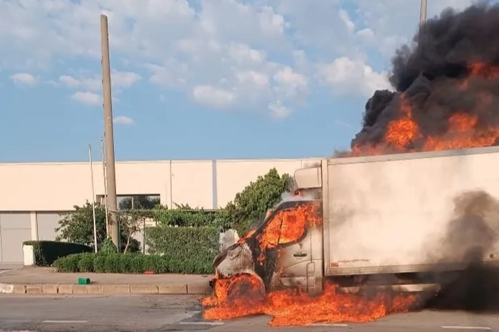 Yangının çıkış nedeni araştırılırken, alev alev yanan kamyonet kameraya saniye saniye yansıdı.