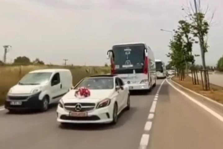 Bursa'da düğün aracı olarak yolcu otobüsünü tercih eden damat ve gelinin yakınları trafikte dikkat çekerken, konvoyda yer alan diğer otomobil sürücüleri ise trafikte tehlikeli hareketler yaparak hem kendilerini hem de diğer sürücüleri riske attı.