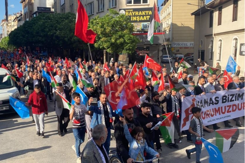 İnegöl Belediyesi eski binası önünde toplanan binlerce kişi "Filistin Yahudi'ye mezar olacak" yazılı dev pankartla Atatürk bulvarı üzerinden Atatürk heykeline kadar yürüdü.