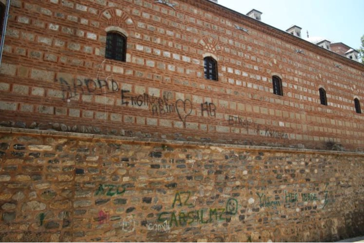 Bursa'da Yıldırım Beyazıd tarafından 1390'lı yıllarda yaptırılan tarihi Yıldırım Külliyesi'nin duvarlarını resim defterine çeviren gençler, sprey boyalarıyla ilan-ı aşklarını da yazmaktan geri kalmadı. Mahalle sakinlerinin iddialarına göre geç saatlerde külliyenin bahçesinde toplanan gençler, ellerindeki sprey boyalarla tarihi mabedin duvarlarına yazılar yazıyor, polis devriyelerini görünce kaçıp saklanıyor. Polis ekipleri gittikten sonra yeniden toplanan gençler, tarihe saygıyı hiçe sayarak kaldıkları yerden devam ediyor. Gençlerin tarihi dokulara zarar verdiğini ve kendilerini de güvende hissetmediklerini söyleyen mahalle sakinleri, kalıcı bir çözüm bulunması gerektiğini ifade etti.