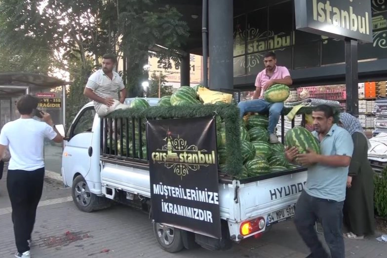 Bursa'da bir zücaciye mağazası, sıcak yaz günlerinde bunalan vatandaşlara serinlemeleri için ücretsiz karpuz dağıttı. Mağazaların önünde 4 kamyon, yaklaşık 20 tonu bulan karpuzlar 25 dakika içinde tükendi. Mağaza sahibi Bekir Yetişen, "Yıllardır bizimle alışveriş yapan müşterilerimizin bu sıcak yaz günü akşamında serinlemelerini istedik" dedi. "20 dakikada tükendi" Mağaza sahibi Bekir Yetişen, "Yıllardır bizimle alışveriş yapan müşterilerimize teşekkür mahiyetinde böyle bir ikramda bulunalım dedik. Bursa'da kazanıyoruz, Bursa'da paylaşıyoruz. Bugün 4 kamyonet, toplamda 20 ton karpuzu müşterilerimize ikramda bulunduk. Müşterilerimizin ilgisi yüksek 20 dakika içerisinde 4 kamyon karpuz tükendi. Bizler de memnunuz, insanların hayır duasını aldık. Bu sıcak yaz gününde insanlarımız karpuzla serinlemiş olacak" şeklinde konuştu.