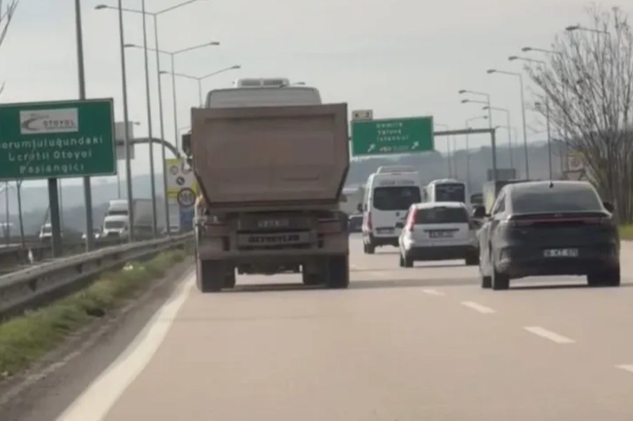 Bursa Çevre Yolu'nda seyir halinde olan bir hafriyat kamyonu, uzun araçların geçişine yasak olan en sol şeride girerek bir süre ilerledi. Kamyon sürücüsü trafik güvenliğini tehlikeye düşürerek, süratli şekilde yoluna devam etti.