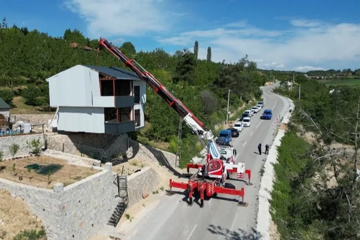 İnegöl Belediyesi'nce Şipali Mahallesi'nde gerçekleştirilen denetimlerde tarım alanına kaçak yapılan villanın sahibi 33 yaşındaki Mesut Yavuz 3 katlı çelik konstrüksiyon yapıyı vinç ile taşıdı.