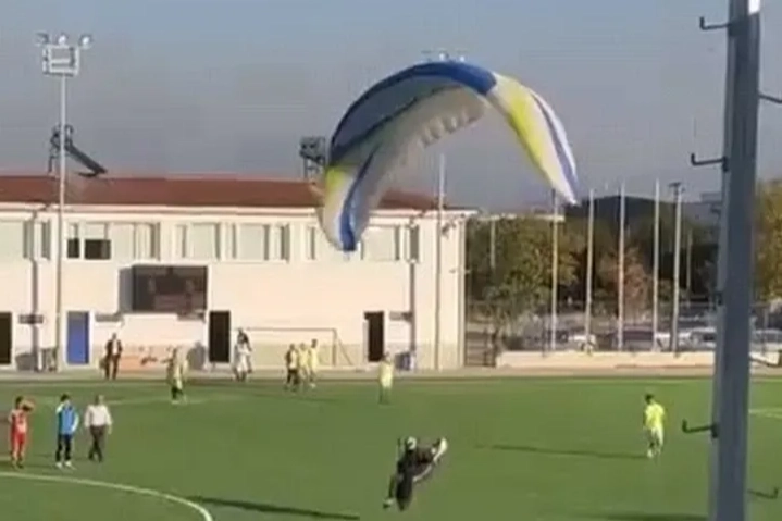Bursa'nın İnegöl ilçesinde 2 yıl önce çalıştığı fabrikanın bahçesine inen paşütçü Adem Keskin, bu kez de maçın oynandığı sahaya iniş yaptı. Paraşüt sporcusunu gören futbolcu ve taraftarlar büyük şok yaşadı.