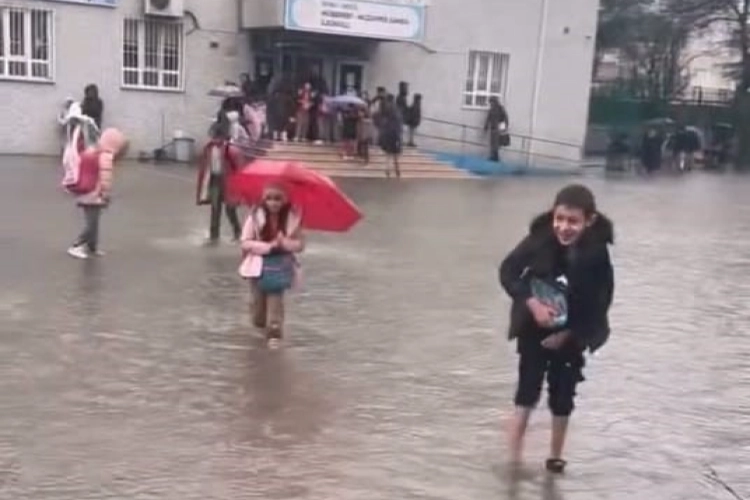 Olay Mahmudiye Mahallesi'nde eğitim öğretime devam eden Müşerref Muzaffer Samda İlkokulu bahçesinde meydana geldi. Yoğun yağış nedeniyle okulun bahçesi göle döndü. Veliler öğrencileri okuldan çıkarmak için bankları sıralayıp geçirdiler