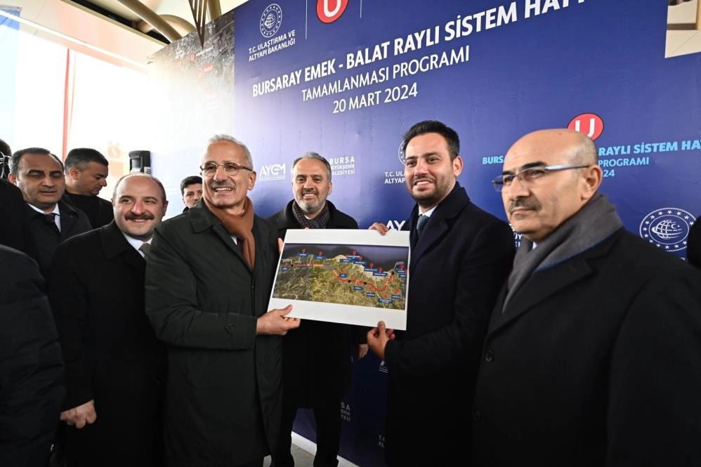 2002 yılından bu yana Cumhurbaşkanımız Sayın Recep Tayyip Erdoğan’ın liderliğinde şehirlerimiz trenlerle birbirlerine bağlarken şehir içi raylı sistemlerini de birbiri ardına hayata geçiriyoruz diyen Ulaştırma ve Altyapı Bakanı Abdülkadir Uraloğlu, “Türkiye Yüzyılında adeta kent için raylı sistem fırtınasını estiriyoruz. Ülke genelinde inşa ettiğimiz kent içi raylı sistem uzunluğumuz 433 km oldu. Değerli Bursalı hemşerilerim sadece İstanbul’da bu sene 34 kilometrelik raylı sistem hattını hayata geçirdik ve Bursa’da bugün buradayız Kocaeli’de hafta sonu yine raylı sistem çalışmalarımızı yürüttük” diye açıkladı. Uraloğlu, İstanbul, Kocaeli ve Bursa’da toplam 47 kilometrelik bir hattın çalışmasını devam ettirdiklerini ifade ederek “Bursa’da hayata geçirdiğimiz Emek-Şehir Hastanesi ve metro hattının bir kısmı Emek istasyonu, Balat istasyonu arasını ve Balat istasyonu tamamlanmasının sevincini yaşıyorum” dedi. Orhangazi‘nin yadigârı, Osmanlı Cihan Devleti'nin ilk büyük başkenti Bursa, başta şanlı tarihimiz olmak üzere sanayinin, ticaretin, tarımın ve turizmin en önde gelen şehirlerinden birisidir. Bu nedenle Bursa’nın ulaşım ve altyapısını güçlendirmek için Bursa’yı geleceğe taşıyacak birçok projeyi birbiri ardına hayata geçirdik ve bundan sonra da yolumuza devam edeceğiz” diye konuştu. Bakan Uraloğlu, 2002 yılından bu yana Bursa’da ulaşım ve iletişim alt yapısına 202 milyar liralık yatırım gerçekleştirdiklerini belirterek “Ulaştırma ve alt yapı bakanlığı olarak bölünmüş uzunluğumuzu 609 km’ye çıkardık. Yine kaplamalı yol uzunluğumuzu 787 km’ye çıkardık. İstanbul- Gebze- Orhangazi İzmir otoyolumuzu bitirdik. Bursa Çevre otoyolunu Bursa-İnegöl-Bozüyük-Ankara sınırı yolumuzu, Bursa Devlet yolu İzmir yolumuzu bitirdik. Önemli güzergahlarımızı tamamladık. Çalı-Kayapa-Hasanağa yolunun ikinci etabını bitirdik. Diğer etapları ile ilgili de yine Büyükşehir belediyemizle gerekli işbirliği içerisinde çalışmalarımızı önümüzdeki dönemlerde yürüteceğiz. Mevcut haliyle 2.9 km bölünmüş yolun 14 kilometresi tek yol olmak üzere 16.9 kilometresi hizmet veren Çalı yolumuzun tamamını inşallah bölünmüş yol haline getireceğiz” dedi.