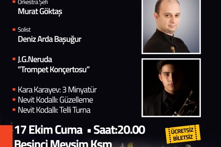 Konserin orkestra şefliğini Murat Göktaş, solistliğini ise genç trompet sanatçısı Deniz Arda Başuğur üstlenecek. Programda J. G. Neruda’nın “Trompet Konçertosu”, Kara Karayev’in “3 Minyatür” adlı eseri ile Türk bestecisi Nevit Kodallı’nın “Güzelleme” ve “Telli Turna” eserleri yer alacak.