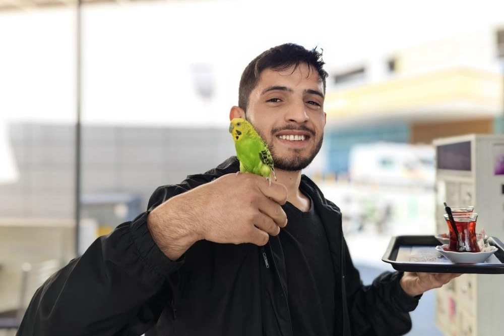 İnegöl Devlet Hastanesi kantininde çay servisi yapan 20 yaşındaki İbrahim Bilici, 2 yıl önce sahiplendiği ve 'İbiş' ismini verdiği muhabbet kuşunu yanından ayırmıyor. Bilici, omzundan ayrılmayan İbiş'le beraber kantinde hizmet veriyor. Çay servisini yapan Bilici'nin omzunda kuşu görenler de bu duruma şaşırıyor.