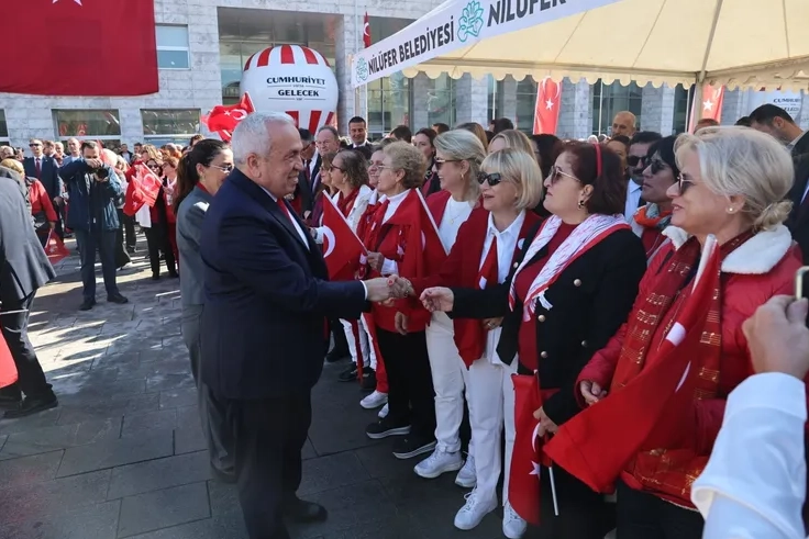 Saygı duruşu ve İstiklal Marşı'nın okunmasının ardından konuşan Nilüfer Belediye Başkanı Şadi Özdemir, "Bugün, bir milletin küllerinden yeniden doğduğu, özgürlüğü, eşitliği ve adaleti temel alan yeni bir yaşamı kurduğu büyük günün yıl dönümündeyiz" dedi.
