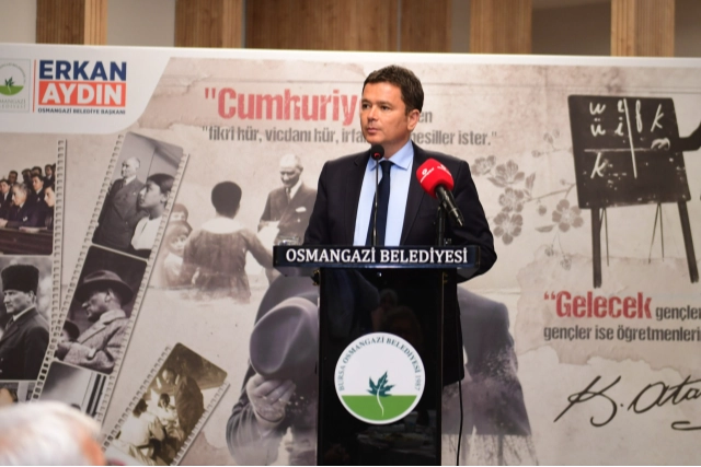 Saygı duruşu ve İstiklal Marşı’nın ardından sözlerine başlamadan önce tüm eğitimcilerin 24 Kasım Öğretmenler Günü’nü içtenlikle kutlayan Osmangazi Belediye Başkanı Erkan Aydın, “Sadece bir gün değil, her gün onların günü olsun. Öğretmenlerimiz, hepimiz için hayatımızda unutamadığımız izler bırakan, anlar bırakan ve kaç yaşına gelirsek gelelim hatıralarımız olan çok güzel insanlar.” dedi.