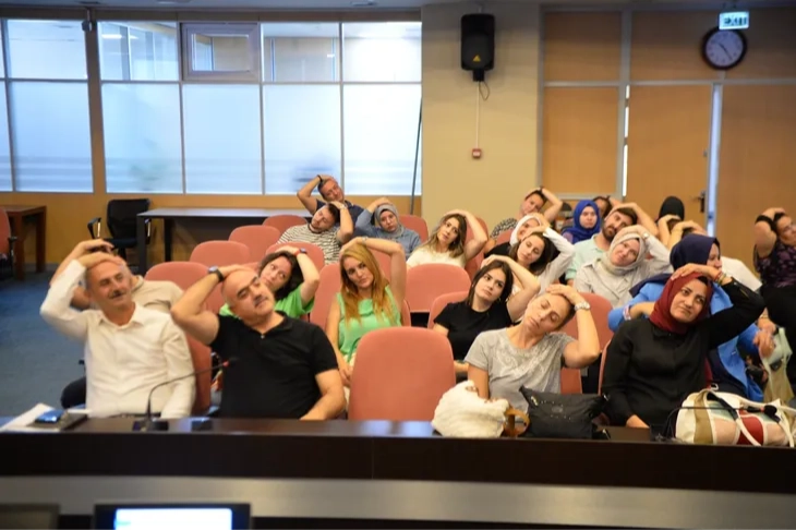 Fizyoterapist Pınar Aydeniz yaptığı bilgilendirmenin ardından masa başında çalışanların mutlaka yapması gereken kültür-fizik hareketlerini uygulamalı olarak gösterdi.