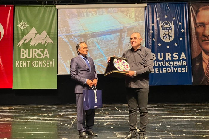 Programın sonunda Bursa Kent Konseyi Başkanı Ertuğrul Aksoy tarafından ünlü şair, yazar, araştırmacı ve tiyatro oyuncusu Sunay Akın’a günün anısına çini tabak hediye edildi.