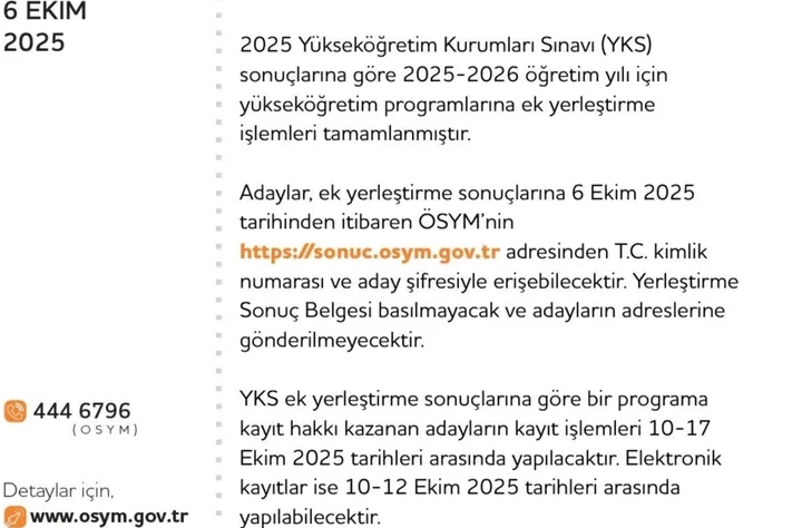2025 YKS ek yerleştirme sonuçları, Öğrenci Seçme ve Yerleştirme Merkezi (ÖSYM) sitesinde açıklandı. Adayların, ek yerleştirme sonuçlarına 6 Ekim 2025 tarihinde saat 16.30'dan itibaren ÖSYM'nin resmi sitesinden T.C. kimlik numarası ve aday şifresiyle erişebilecekleri belirtildi. ÖSYM'nin sosyal hesabından yapılan paylaşımda şu ifadeler yer verildi: "2025 Yükseköğretim Kurumları Sınavı (YKS) sonuçlarına göre 2025-2026 öğretim yılı için yükseköğretim programlarına ek yerleştirme işlemleri tamamlanmıştır. Adaylar, ek yerleştirme sonuçlarına 6 Ekim 2025 tarihinde saat 16.30'dan itibaren ÖSYM'nin https://sonuc.osym.gov.tr adresinden T.C. kimlik numarası ve aday şifresiyle erişebilecektir. Yerleştirme Sonuç Belgesi basılmayacak ve adayların adreslerine gönderilmeyecektir. YKS ek yerleştirme sonuçlarına göre bir programa kayıt hakkı kazanan adayların kayıt işlemleri 10-17 Ekim 2025 tarihleri arasında yapılacaktır. Elektronik kayıtlar ise 10-12 Ekim 2025 tarihleri arasında yapılabilecektir. Kayıt için adayların yerleştirildikleri yükseköğretim programının bağlı bulunduğu üniversiteye süresi içinde başvurmaları gerekmektedir. Elektronik kayıt yapan adaylar, üniversiteleri tarafından duyurulan tarihe ve ilgili belgelere göre işlem yapacaktır. Ek yerleştirme sonuçlarına ilişkin sayısal bilgiler Ek'te sunulmuştur."