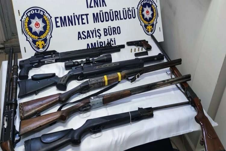 Bursa’da İznik İlçe Emniyet Müdürlüğü ekipleri, E.T. ve K.C.’ye ait iki ayrı adrese operasyon yaptı. Yapılan aramalarda, ruhsatsız 7 adet av tüfeği, 1 adet ruhsatsız 9 minimetre tabanca, 1 adet Bursa il merkezinden çalıntı motosiklet ve 1 adet şase-motor numaraları kazılı motosiklet ele geçirildi. İki şüpheli hakkında soruşturma başlatıldı.
