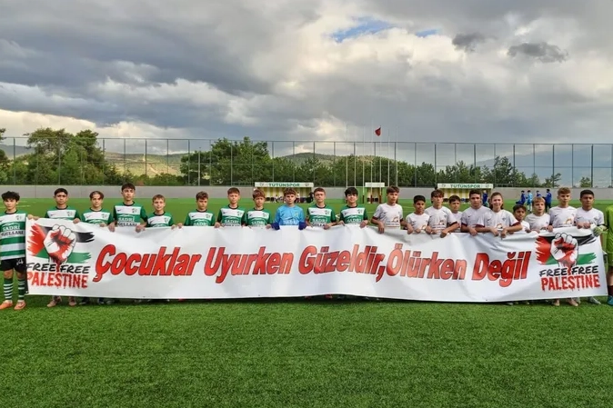 Çoluk çocuk demeden herkesi katleden katil İsrail’e bir tepki de Bursa’daki Tütünspor’da oynayan genç sporculardan geldi . Demirtaş stadında oynanan U 14 takımları Tütünspor İnegöl genç yıldızlar karşılaşması öncesinde sahaya çıkan gençler açtığı pankart ile herkesi duygulandırdı. Genç sporcular "çocuklar uyurken güzeldir ölürken değil" pankartı ile büyük küçük demeden herkes tarafından takdirle karşılandı.