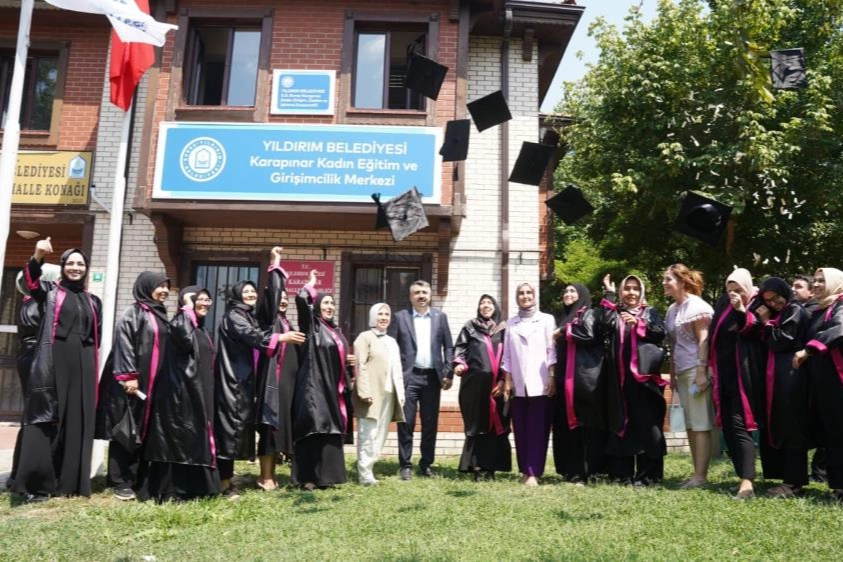 Karapınar Kadın Eğitim ve Girişimcilik Merkezi’nden mezun olan 18 kadın, kooperatifte çalışmaya hazır hale geldi. Yıldırım Belediyesi, hizmete açtığı 12 kooperatifi ve 25 eğitim ve girişimcilik merkezi ile kadınları ekonomik ve sosyal açıdan güçlendiriyor. Binlerce kadının başarı hikayesi yazdığı merkezler, kadınların emeklerini ekonomik değere dönüştürdüğü önemli bir gelir kapısı haline geldi. Yıldırım Belediye Başkanı Oktay Yılmaz, bu başarı hikayelerinden birine imza atan Karapınar Kadın Eğitim ve Girişimcilik Merkezi’nde giyim üretim teknolojileri alanında eğitimlerini başarıyla tamamlayan 18 kadının mutluluğuna ortak oldu. Hayatlarında ilk kez cübbe giymenin heyecanını yaşayan kadınlar kendilerine bu imkanı sunan Yıldırım Belediye Başkanı Oktay Yılmaz’a teşekkür etti.