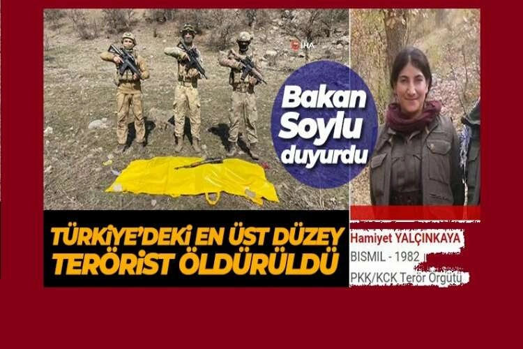 İçişleri Bakanı Soylu, Eren Abluka Bestler Dereler Operasyonu’nda Sözde Botan Saha Sorumlusu Kırmızı Kategorideki “Leyla Amed” kod adlı terörist Hamiyet Yalçınkaya’nın etkisiz hale getirildiğini duyurdu.