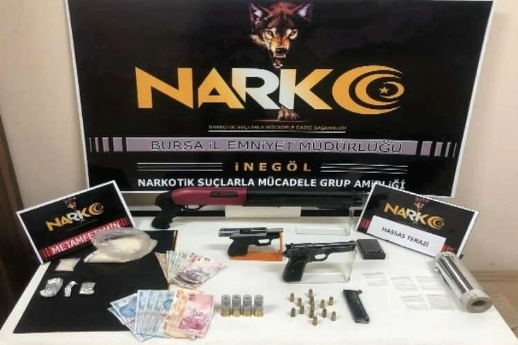 Edinilen bilgilere göre, İnegöl Narkotik Suçlarla Mücadele Grup Amirliği ekiplerince uyuşturucu madde ticareti yaptıkları belirlenen şahıslar takibe alındı. Düzenlenen operasyonda ekipleri fark eden şahıslar kaçmaya çalışırken yakalandı. Ekiplerin şahısların mesken tutukları yer ve araç içerisinde yapılan aramalarda; toplam 241,09 gram metamfetamin maddesi, 1 adet hassas terazi, uyuşturucu paketlemede kullanılan boş kilitli poşetler ve alüminyum folyolar, uyuşturucu ticaretinden kazanıldığı düşünülen 830 TL para, 2 adet ruhsatsız silah ve silaha ait 12 adet 9 mm mermi, 1 adet ruhsatsız pompalı tüfek ve tüfeğe ait 4 adet mermi ele geçirildi.