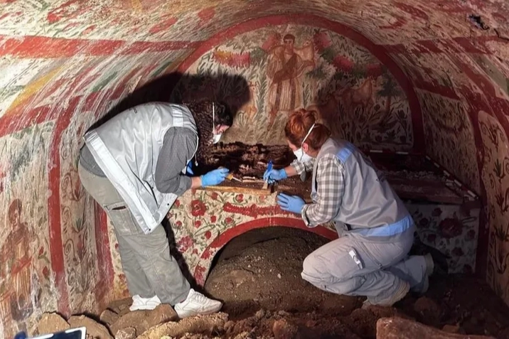 Mezarın kuzey duvarına bitişik klinein pişmiş toprak kare levhalarla kaplı olduğu, ölülerin bu levhaların üzerine yatırıldığı belirlendi. Klinein ardındaki kuzey duvarında ise nadir görülen 'Çoban İsa' figürü dikkat çekti.