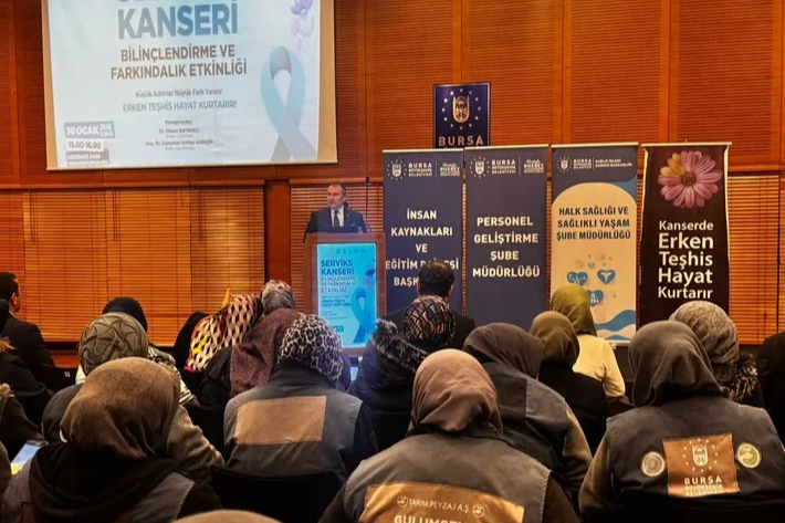 Ocak ayının Serviks Kanseri Farkındalık Ayı olarak kabul edilmesi kapsamında, Bursa Büyükşehir Belediyesi tarafından kadın çalışanlara yönelik ‘Serviks Kanseri Bilinçlendirme ve Farkındalık Etkinliği’ düzenlendi. İnsan Kaynakları ve Eğitim Dairesi Başkanlığı ile Sağlık İşleri Dairesi Başkanlığı iş birliğinde, İl Sağlık Müdürlüğü’nün desteğiyle gerçekleştirilen program, Atatürk Kültür Merkezi Merinos Yerleşkesi’nde yapıldı. Kadınlar arasında en sık görülen kanser türlerinden biri olan rahim ağzı kanserinin, düzenli tarama testleri sayesinde büyük oranda önlenebildiği ya da erken evrede teşhis edilebildiği vurgulanan etkinlikte, hastalıkla ilgili toplumsal farkındalığın artırılmasının önemi ele alındı. Programda Dr. Didem Bayrakçı, serviks kanseri taramaları, HPV testi ve smear testinin erken teşhisteki rolüne ilişkin bilgiler verdi. Doç. Dr. Süleyman Serkan Karaşin ise rahim ağzı kanserinin nedenleri, risk faktörleri, korunma yöntemleri ve güncel tedavi yaklaşımlarını katılımcılarla paylaştı. Sunumların ardından katılımcılar, merak ettikleri konular hakkında uzmanlara soru sorma imkânı buldu. Etkinliğe katılan Bursa Büyükşehir Belediyesi Genel Sekreter Yardımcısı Mehmet Emin Direkçi, rahim ağzı kanserinin önlenebilir bir hastalık olduğuna dikkat çekerek, “Kadınların sağlık konusunda bilinçlenmesi, güçlü ve sağlıklı bir toplumun temelini oluşturur. Erken teşhis hayat kurtarır ve bu bilincin toplumun her kesimine yayılması büyük önem taşımaktadır” dedi. Direkçi, Bursa Büyükşehir Belediyesi olarak önleyici sağlık hizmetlerini ve farkındalık çalışmalarını kararlılıkla sürdürdüklerini ifade etti.