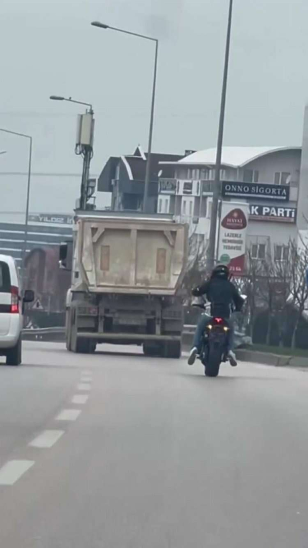 Bursa’da trafiği tehlikeye düşüren bir motosiklet sürücüsü akan trafikte tek teker ilerledi.