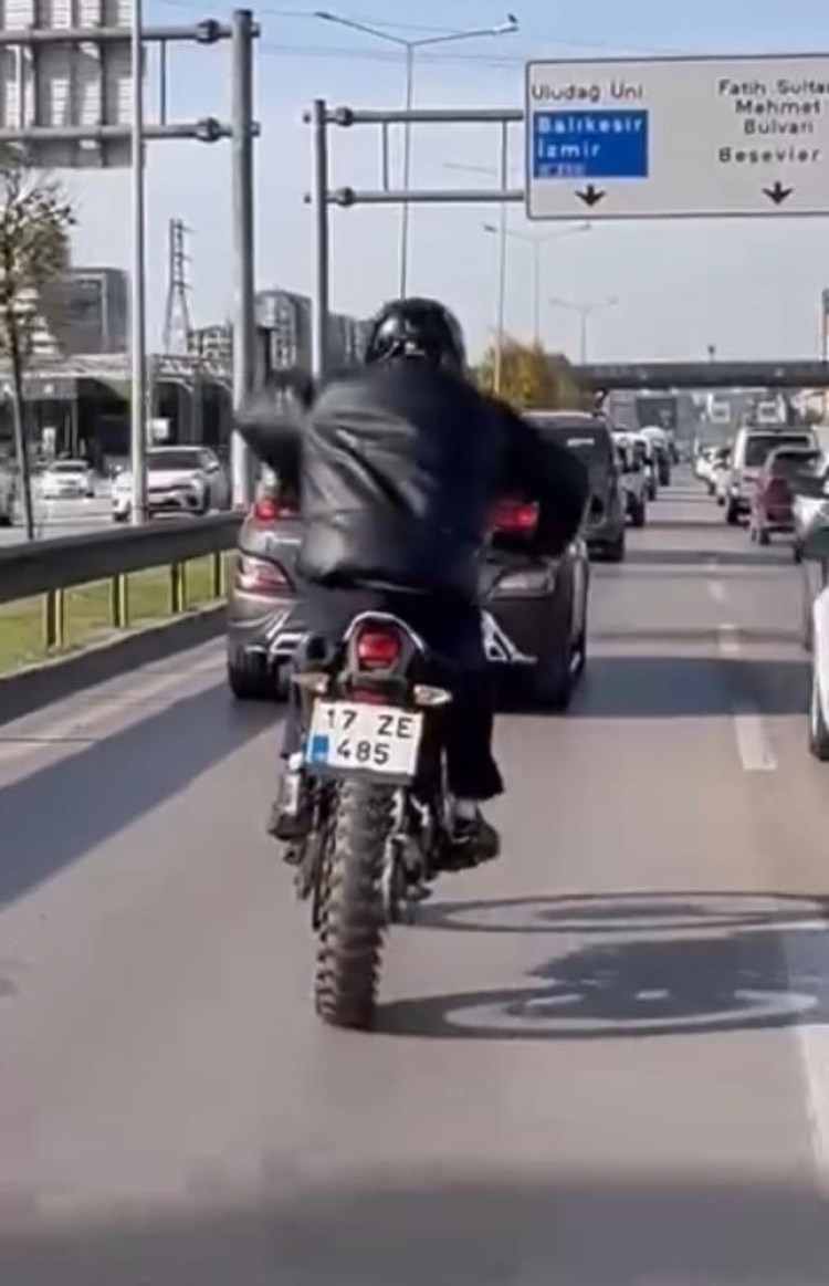 Bursa'da seyir halindeki bir sürücü motosikletini ata biner gibi sürdü. Trafiği tehlikeye düşüren o anlar kameraya yansıdı.