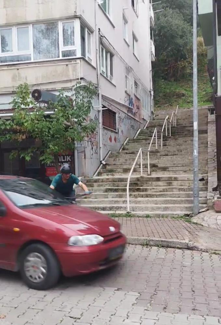 Bursa'da bisikletiyle merdivenlerden aşağı inen genç otomobilin vurmasıyla savruldu. Kaza anı ise kendisini video çeken arkadaşının kamerasına anbean yansırken, bölgede esnaflık yapan vatandaşlar sürekli kazaların yaşandığını belirterek yetkililerden duruma el atmasını istedi.