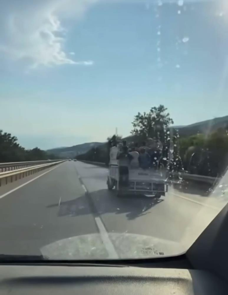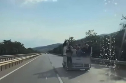 Bursa'da kamyonetin kasasında tehlikeli yolculuk yapan mevsimlik işçiler amatör kameraya yansıdı.