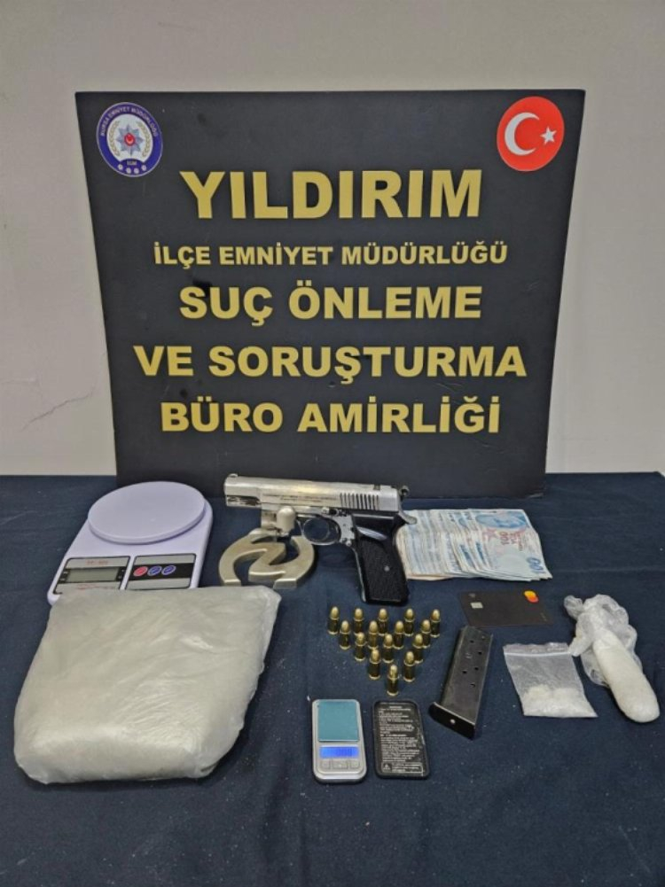 2 hafta fiziki takip sonrası kurulan özel ekip, şüpheli C.B. (31), O.S. (24) ve R.G.'nin (22) merkez Yıldırım ilçesi Setbaşı mevkiindeki adreste ikamet ettiğini tespit etti. İkamete yapılan baskında 1 kilo 226 gram metamfetamin, 2 adet hassas terazi, 1 adet 9mm çapında ruhsatsız tabanca, 15 adet mermi, madde satışından kazanıldığı değerlendirilen bin 450 lira, 1 adet banka kartı ele geçirildi. Ayrıca, O.S.’nin yapılan UYAP sorgusunda 4 ayrı suçtan 4 yıl 2 ay kesinleşmiş hapis cezası olduğu anlaşıldı. Şüphelilerden C.B. ve O.S. tutuklanarak cezaevine gönderilirken, R.G. ise adli kontrol şartıyla serbest kaldı.