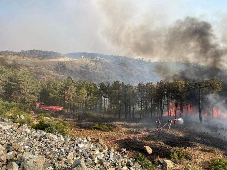 Kocaeli Büyükşehir Belediyesi itfaiye ekipleri de yangının başlangıcından bu yana sahadaki söndürme ve soğutma çalışmalarında aktif rol üstleniyor.