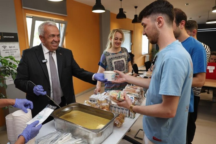 Başkan Şadi Özdemir, daha sonra çorba ve soğuk sandviç ikramında bulundu. Başkan Şadi Özdemir, doldurduğu çorba kaseleri tek tek öğrencilere vererek, “Afiyet olsun” dedi.