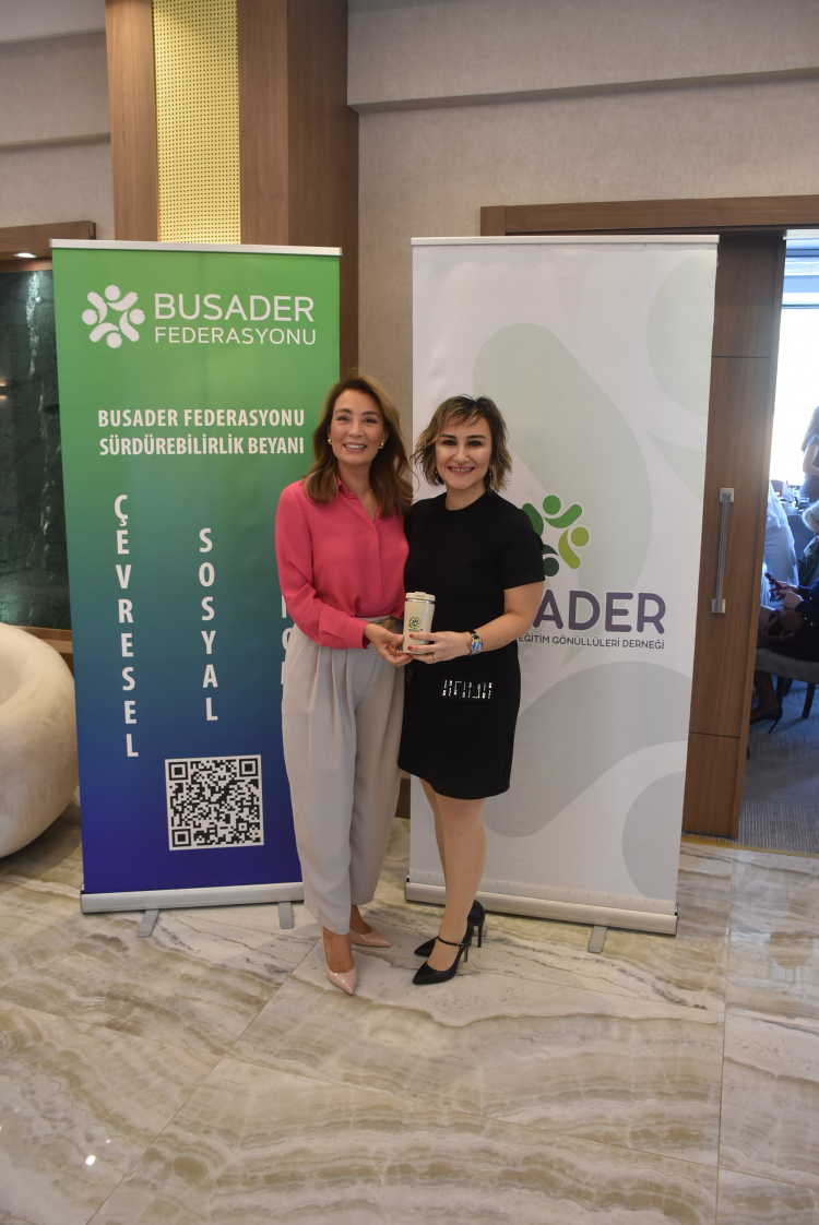 Programın sonunda Bursa BUSADER Başkanı Elif Evke tarafından Dr. Aslı Aktümen’e, BUSADER tarafından geri dönüşümde farkındalık oluşturmak amacıyla zeytin çekirdekleri kullanılarak yapılan termos hediye edildi.