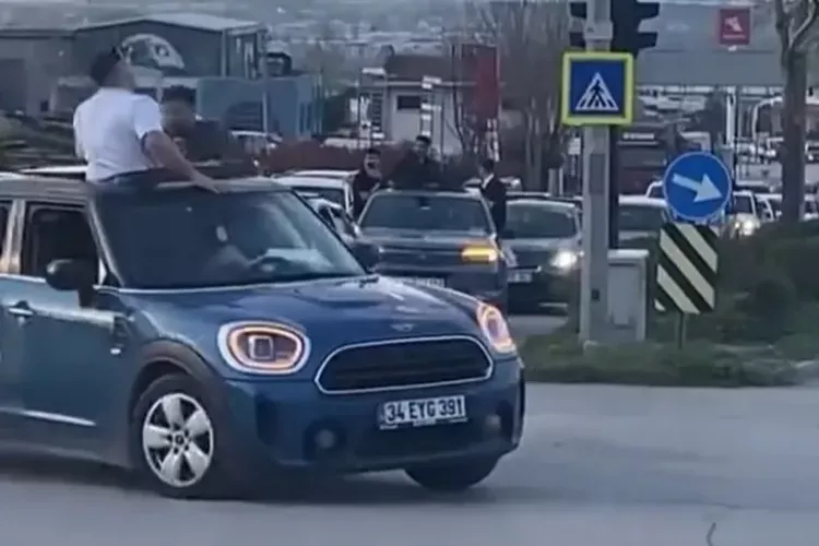 Yaklaşık 7 aracın camlarından ve sunrooflarından çıkan vatandaşlar trafik kurallarını hiçe saydı.