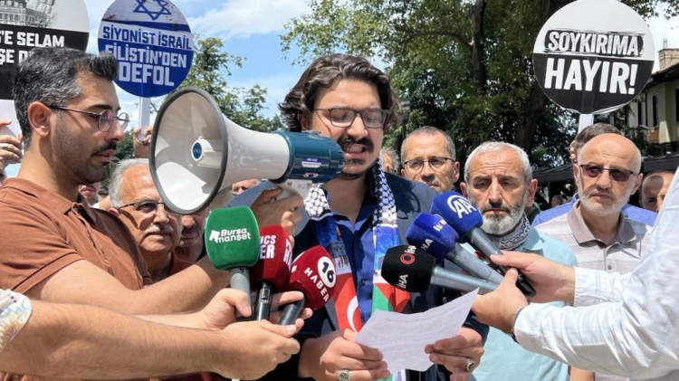 Ulu Cami'de cuma namazı sonrası gerçekleştirilen protestoda Bursa Gönüllü Kuruluşlar Platformu ve çok sayıda vatandaş bir araya geldi. Bir araya gelen vatandaşlar Filistin'in yanında olduklarını belirtti. Bursa Gönüllü Kuruluşlar Platformu sözcüsü Furkan Arı, "Gazze'deki soykırım insanlık tarihine kara bir leke olarak kazınırken, ABD, İsrail Başbakanı, soykırımcı, savaş suçlusu Netanyahu'yu ülkesine davet etmiş, ABD Parlamentosu'nda konuşma imkanı sunmuştur. Netanyahu'nun Gazze'deki vahşetle alay edercesine kurduğu hakikat dışı cümleler ABD'li parlamenterler tarafından sık sık, çoğunlukla da ayakta alkışlanmıştır. ABD Parlamentosu, tıpkı Hitler Almanya'sının Reichstag'ı gibi, yüzyıllar boyunca hafızalardan silinmeyecek bir utanç fotoğrafı vermiştir.
