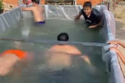 Bursa'nın Yenişehir ilçesinde sahibi olduğu kamyonun kasasını naylon ile kaplayıp içerisine su dolduran bir vatandaş kamyonu çocuklar için yüzme havuzu haline getirdi.