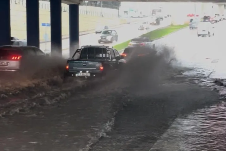 Bursa'da bir süredir devam eden lodos, yerini sağanak yağışa bıraktı. Yoğun yağışın ardından alt geçitte biriken sular, zaman zaman araç trafiğinin yoğun olduğu kavşakta ulaşımı olumsuz etkiledi. Su seviyesinin yükselmesiyle birlikte sular kaldırımlara kadar taştı.
