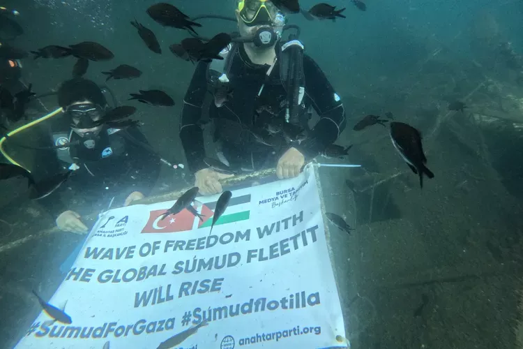 Bursa'da şehit ve gazi yakını bir grup dalış gerçekleştirdikleri deniz altından İsrail zulmü altındaki Filistin halkı ve Gazze yolunda ilerleyen Küresel Sumud filosuna destek verdi.