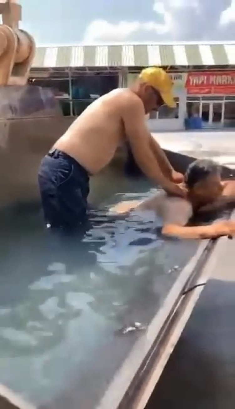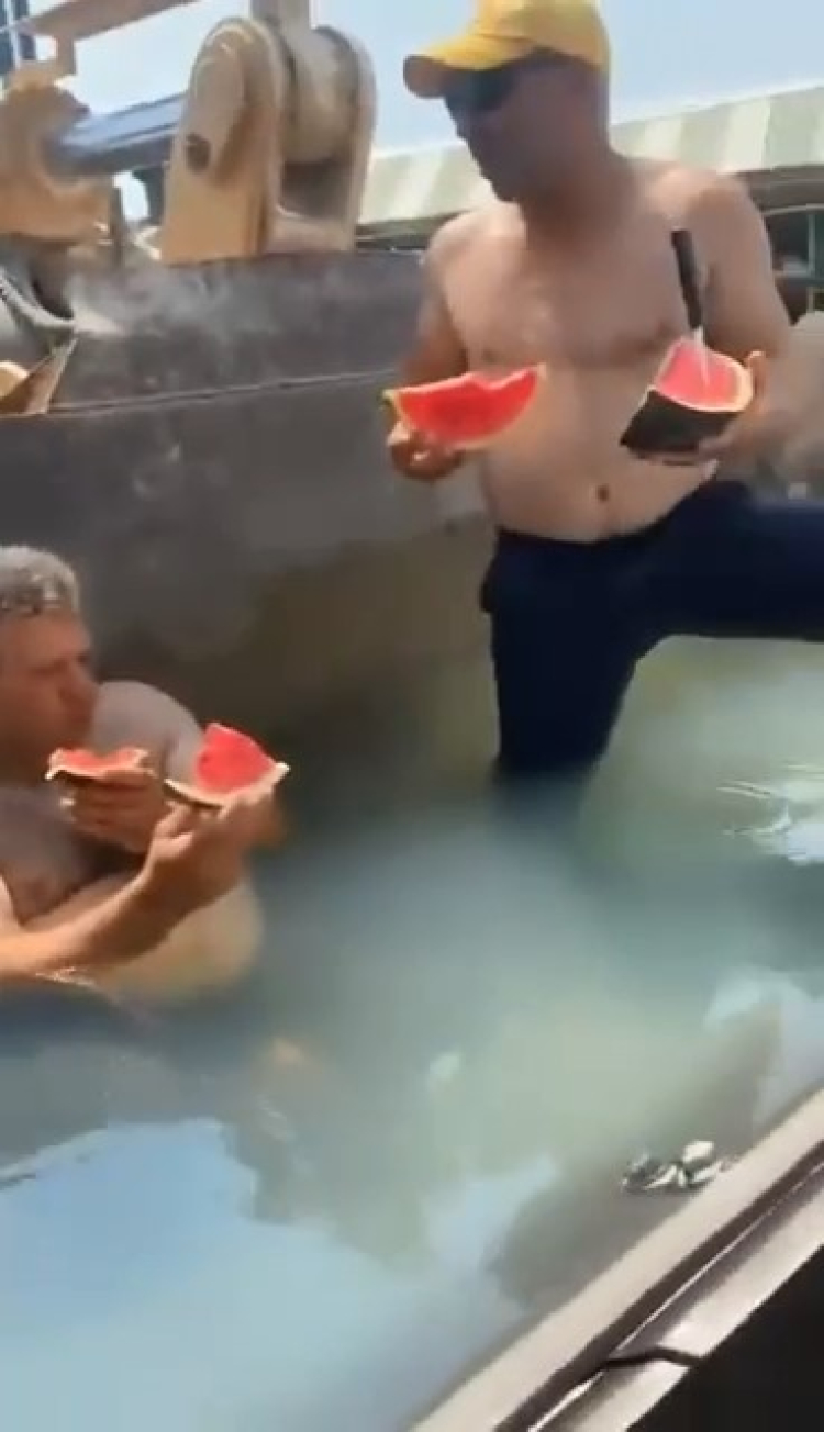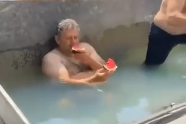 İznik ilçesinde bir inşaatta çalışan işçiler 40 derece sıcaktan bunaldı. Çare olarak kepçenin küreğine su dolduran işçiler, havuz keyfi yaptı. Kimisi suyun içinde karpuz yerken, kimisi de su içinde arkadaşına masaj yaptı. İşçiler, kepçeyi havuza çevirerek serinlediği anları amatör kamera ile ölümsüzleştirdi.