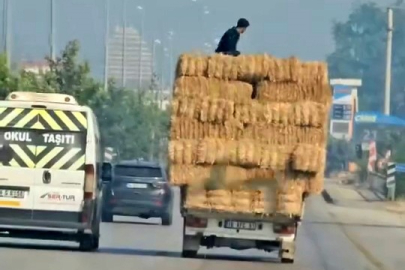 Bursa'nın İnegöl ilçesinde meydana gelen olayda istiflenen saman balyalarının üzerinde oturan gencin tehlikeli yolculuğunu görenler durumu hayretle izledi.