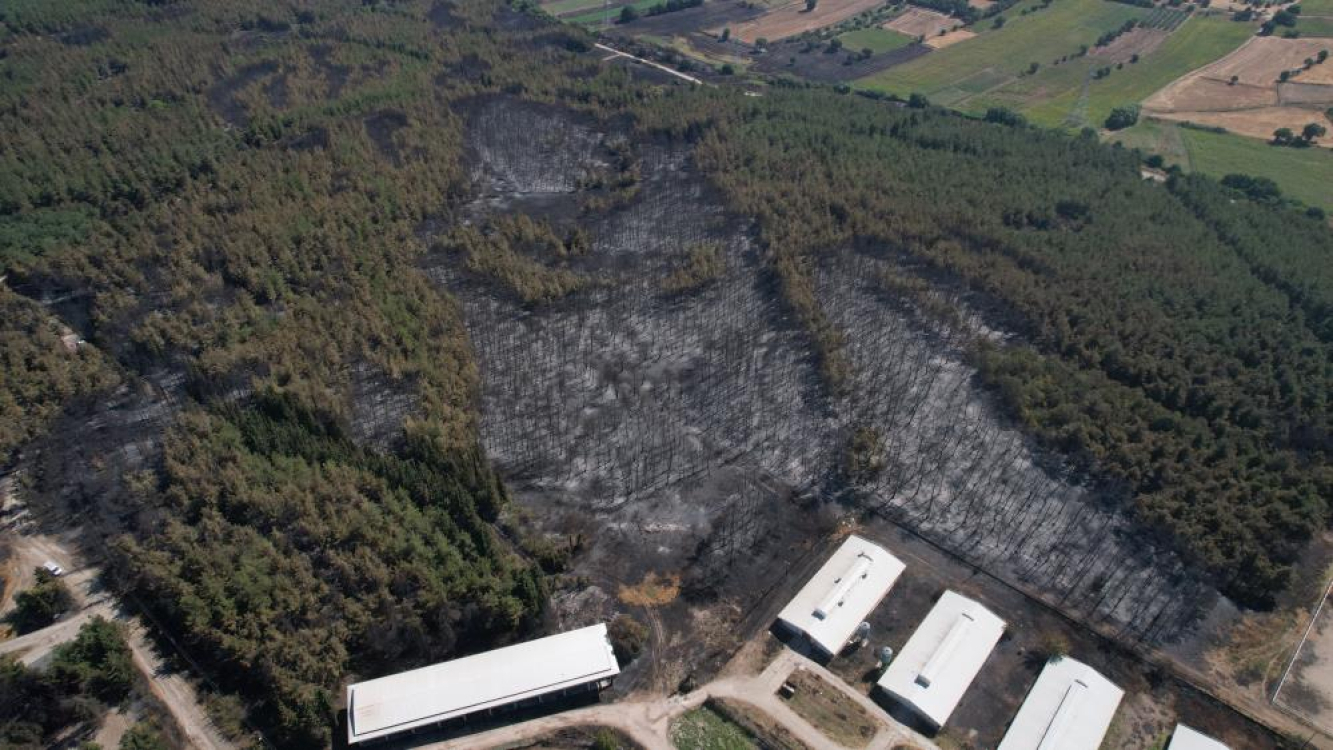 Bursa'da anız yangını olarak başlayan ve sonrasında Uludağ Üniversitesi kampüsündeki ormanlık alana sıçrayan yangının acı bilançosu bugünün ilk ışıklarıyla havadan görüntülendi. Görüntülerde Veterinerlik Fakültesi'nin tesislerinin ve barınaklarının da büyük tehlike atlattığı gözler önüne serildi.