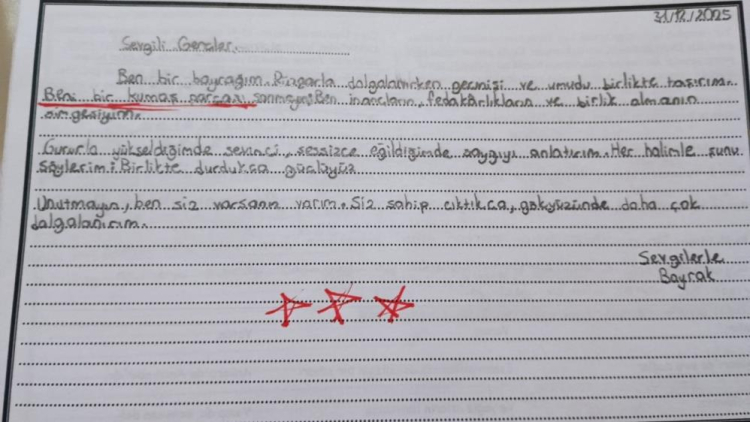 Etkinlikler çerçevesinde Türkçe öğretmeni tarafından öğrencilere "Bayrağın öğrenciye seslenişi" konulu bir paragraf yazma çalışması da yaptırıldı. Çalışma kapsamında 6/D sınıfı öğrencisi Sena Selen tarafından kaleme alınan paragraf, içerdiği duygu ve anlatımıyla dikkat çekti.