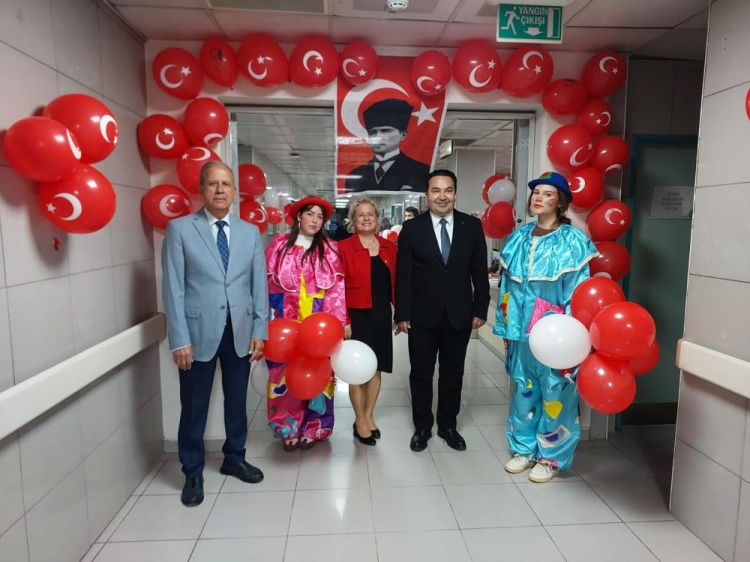 Önce, Bursa Yüksek İhtisas Eğitim ve Araştırma Hastanesi'ne giden koro üyeleri,23 Nisan için bayrak ve balonlarla donatılmış, palyaçolarında yer aldığı çocuk kliniğinde her yaşta yatan çocukları Başhekim Doç. Dr. Mehmet Oğuzhan Ay, Başhekim Yardımcısı Uzm. Dr. Muhammed Arap ve Sağlık Bakım Hizmetleri Müdürü Medine Seymen Aybey ile birlikte tek tek ziyaret ederek yaşlarına uygun oyuncak, giyim ve zeka oyunları armağan etti. 23 Nisan Ulusal Egemenlik ve Çocuk Bayramlarını kutladı.