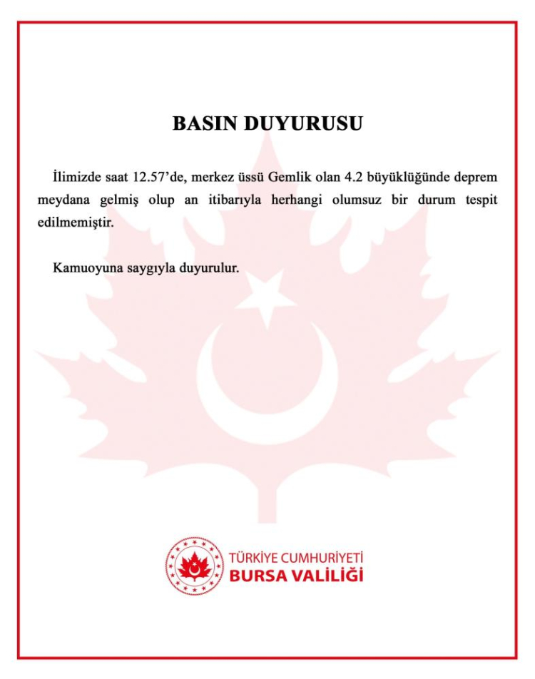 Bursa Valiliğinden konuya ilişkin yapılan açıklamada, "İlimizde saat 12.57’de merkez üssü Gemlik olan 4.2 büyüklüğünde deprem meydana gelmiş olup an itibarıyla herhangi olumsuz bir durum tespit edilmemiştir" ifadeleri yer aldı.