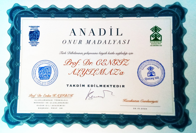 Kazakistan Cumhuriyeti Halkaralık Kazak Tili Akademiyası (Uluslararası Kazak Dili Akademisi) tarafından 2024 yılı içerisinde “Ana Dil Onur Madalyası”na ve Kosova Cumhuriyeti Priştine Üniversitesi Filoloji Fakültesi tarafından “Yılın Bilim Adamı Ödülü”ne de layık görülen Prof. Dr. Cengiz Alyızmaz’a, BUÜ Fen-Edebiyat Fakültesi Dekanı Prof. Dr. Bilgen Osman tarafından da teşekkür belgesi takdim edildi.